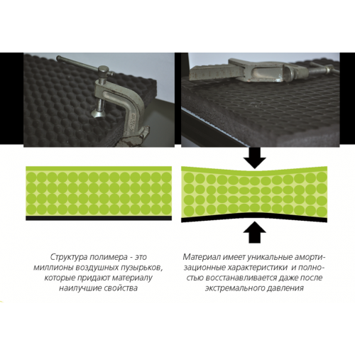 • Прекрасные теплоизоляционные свойства Мат-подстилка представляет собой двухслойный материал. В технологии изготовления процесс протекает в одну стадию и двухслойным материал получается еще во время изготовления. По сути, покрытие является монолитным, но каждый слой обладает специально заданными свойствами. При изготовлении не используется клей, поэтому Вы можете не беспокоиться о расслаивании материала, потери прочности и проблем, свойственных другим материалам. Используемый EVA-полимер вулканизирован, что обеспечивает высокие прочностные, эластические и амортизационные свойства покрытия.