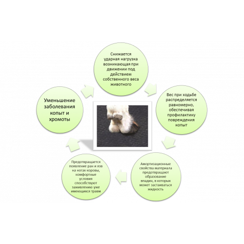 Верхний не скользящий слой. Специальная текстура поверхности материала и использование EVA-полимера обеспечивает отсутствие скольжения. В результате больше комфорта для животного и никаких травм при проскальзывании. Благодаря мягкой поверхности животные при посадке не повреждают колени и суставы, уменьшается травматизм, коровы ведут себя спокойно, лучше чувствуют себя в стойле, испытывают меньше стрессов, что очень важно для высокой производительности.